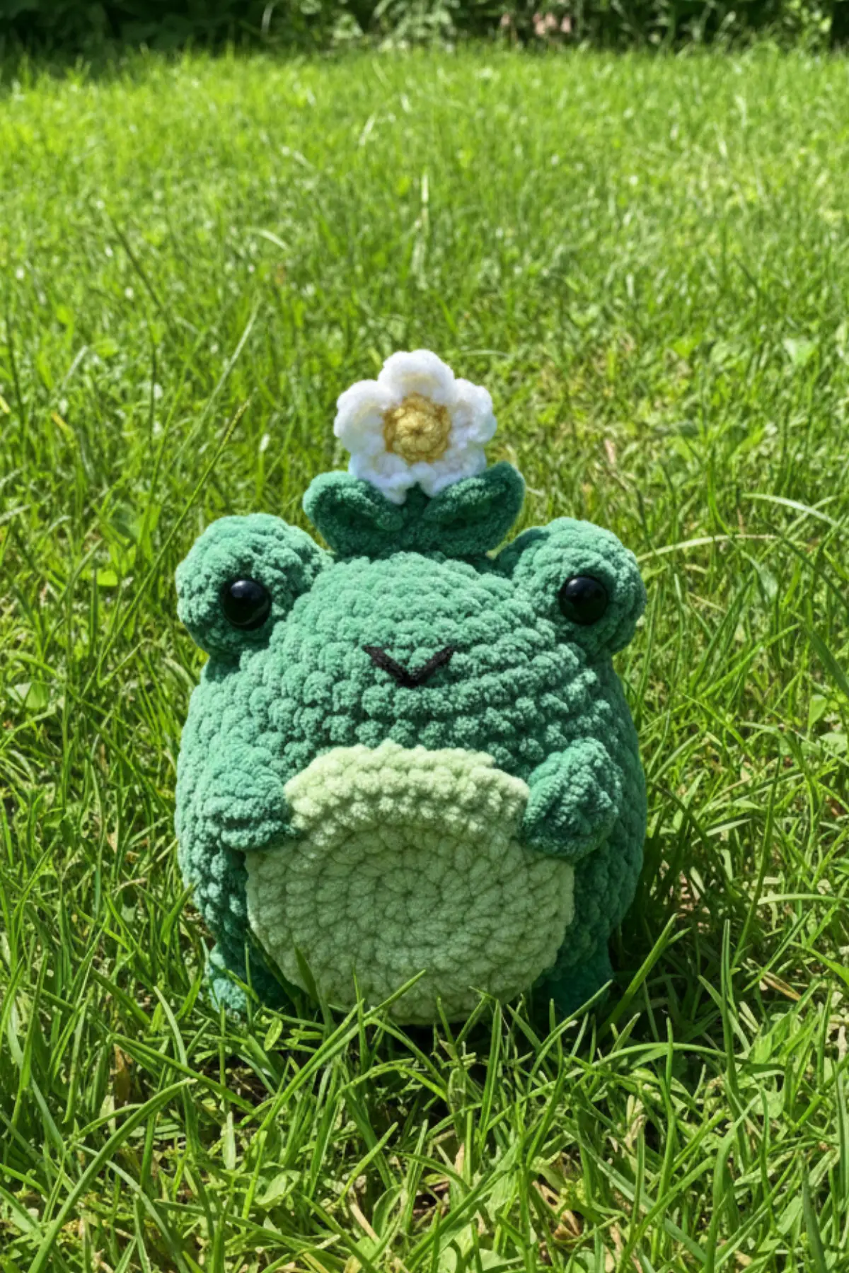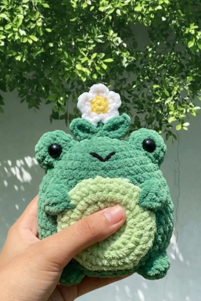 This amigurumi plush frog pattern is a free and beginner-friendly crochet pattern designed for super bulky chenille or velvet yarn. It helps you create a soft, squishy frog plush with a cute flower detail, perfect for gifts or home décor.