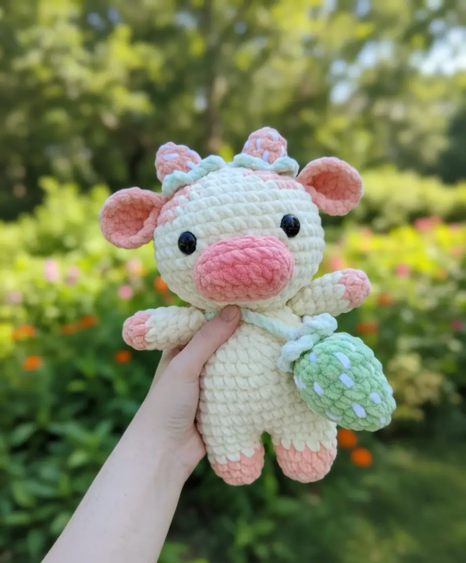 Looking for an irresistibly cute amigurumi project? This plush strawberry cow combines the sweetness of a classic farm animal with charming strawberry-themed details. Standing at 12 inches tall, this huggable toy makes the perfect handmade gift or room decoration. Whether you’re an intermediate crocheter or looking to expand your amigurumi skills, this detailed pattern will guide you through creating your very own strawberry cow companion, complete with pink spots, adorable horns, and even a tiny strawberry bag accessory!